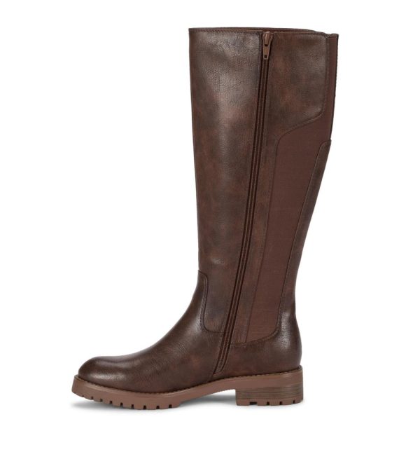 We love our tall boots!Our Danen tall riding boot is just our type featuring manmade leather, a lugged sole, elastic goring on the sides for comfort and fashionable metal buttons.